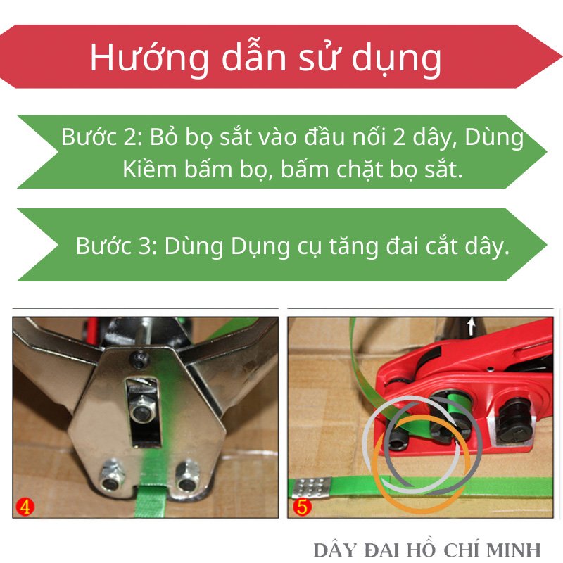 Bộ cũng gồm 01 siết căng dây đai và 01 kiềm bấm bọ, kẹp dây đai.